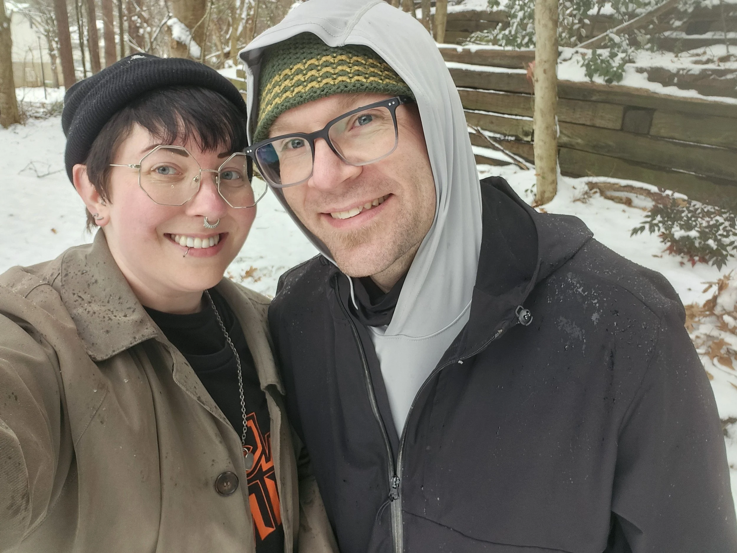 Noah and I are both into hiking, him more than me, so we were undeterred and ever prepared. We wrapped ourselves up in warm clothes and took our hiking sticks outside with us just in case. I directed him over to the area of my neighborhood that's the most woodsy-looking and we had a photoshoot.